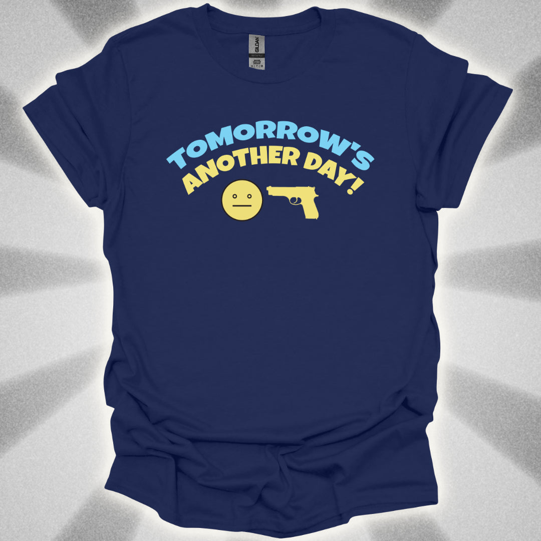 And just so we’re crystal fucking clear, this isn’t some cute little motivational slogan. That’s why the bottom of the design features a completely dead-inside emoji with a gun icon pointed at its head, because nothing quite captures the soul-crushing thrill of another glorious morning like staring into the abyss and realizing—oh great, I get to do it all over again.